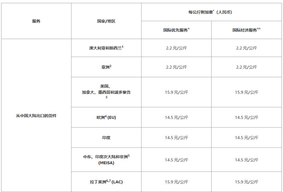 Fedex則計劃于9月16日起征繳需求附加費(fèi)。Fedex方聲稱當(dāng)運(yùn)量增長、運(yùn)力需求的增加、運(yùn)營成本增加還有其運(yùn)營網(wǎng)絡(luò)面臨別的壓力時,F(xiàn)edEx也許會收取需求附加費(fèi),詳細(xì)如下↓