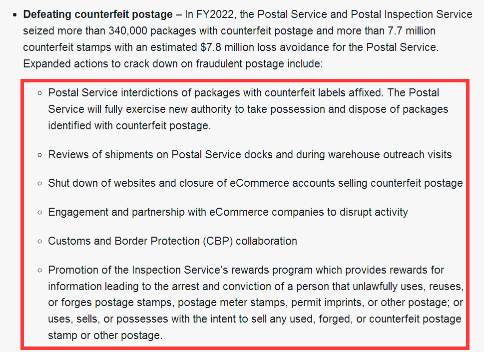 在假面單方面,2022財年,郵政管理局和郵政檢查局破獲了超出34萬個帶有虛假面單的包裹和超出770萬張偽造郵票,預(yù)估為郵政管理局規(guī)避了780萬美元的損失。
